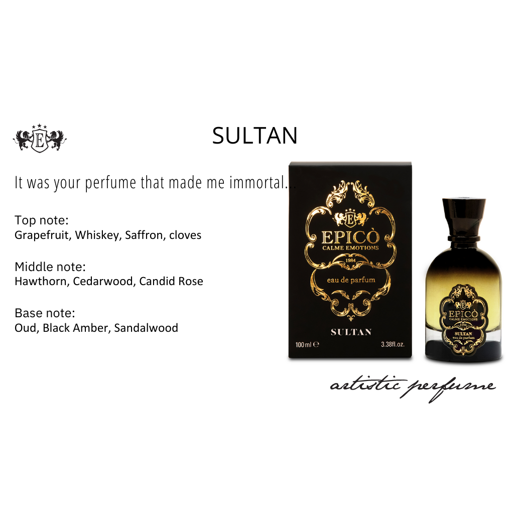 ...It was your perfume that made me immortal... SENSUAL HOT AND MYSTERIOUS. Of SULTAN we can certainly say that it is an olfactory experiment... well done. The note Saffron, bittersweet, intimate like terraceo honey mixes with the bursting freshness of grapefruit and cloves, pungent and lively. The whiskey accord gives an unprecedented charm to this sweet oriental fragrance. The white rose and cedar wood open the way to woods such as oud and sandalwood, increasing the mystery, and black amber intensifies the charm of this perfume that makes us fly to the east with sweetness and preciousness.