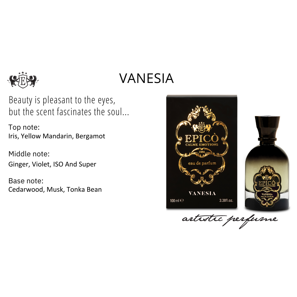 ...Beauty is pleasant to the eyes, but the scent fascinates the soul... Is it really frivolous and silly to take care of yourself? Highlighting one's physical, intellectual or moral qualities sometimes makes us appear vain and frivolous, and makes all of this appear wrong, when it is not. For Epico 'vanity is as if it were a work of the theater; it means looking, getting used to observing, immersing oneself and contemplating; no one would be vain if he couldn't see himself and, above all, if he couldn't be seen. Vanesia is the expression of an inner language, which does not want to impress, but fascinates in its simplicity. In the opera the first two actors, are bergamot and yellow mandarin that stand out immediately, thanks to their role of light and that of energy and freshness and just as we were in the theater, the iris becomes the soundtrack that will accompany the whole Opera. It starts slowly with a light introduction, but which helps the other characters to come out and have their say, as happens with the delicacy of the violet and the liveliness of the ginger, but while the work reaches the heart of its show the iris enters on stage and grows, grows more and more, thanks to an orchestra that supports it, made of cedar wood, muscho and a tonca bean that embraces and comforts her ... The work of love of vanity for oneself ends with a predominant iris, delicate, sweet and fascinating for the soul.
